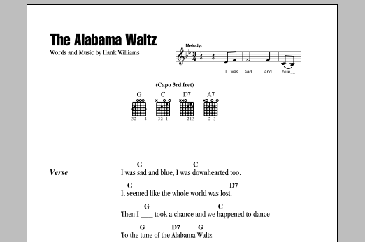 Download or print Hank Williams The Alabama Waltz sheet music, chords and digital score arranged for Piano, Vocal & Guitar Chords (Right-Hand Melody). This Country score includes 3 page(s).