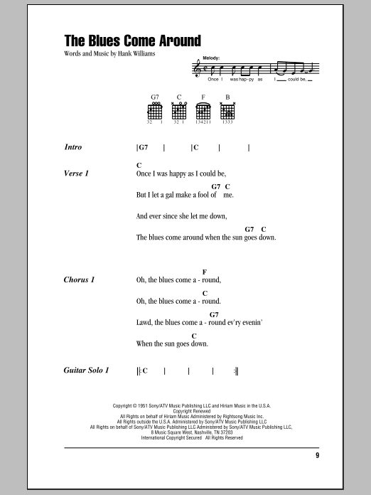 Download or print Hank Williams The Blues Come Around sheet music, chords and digital score arranged for Piano, Vocal & Guitar Chords (Right-Hand Melody). This Country score includes 2 page(s).