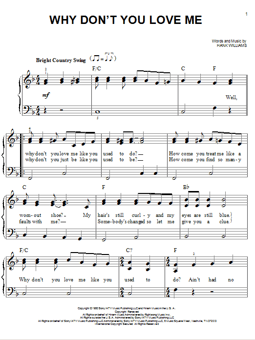 Download or print Hank Williams Why Don't You Love Me sheet music, chords and digital score arranged for Piano, Vocal & Guitar Chords (Right-Hand Melody). This Country score includes 2 page(s).