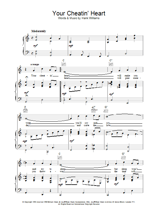 Download or print Hank Williams Your Cheatin' Heart sheet music, chords and digital score arranged for Very Easy Piano. This Country score includes 3 page(s).