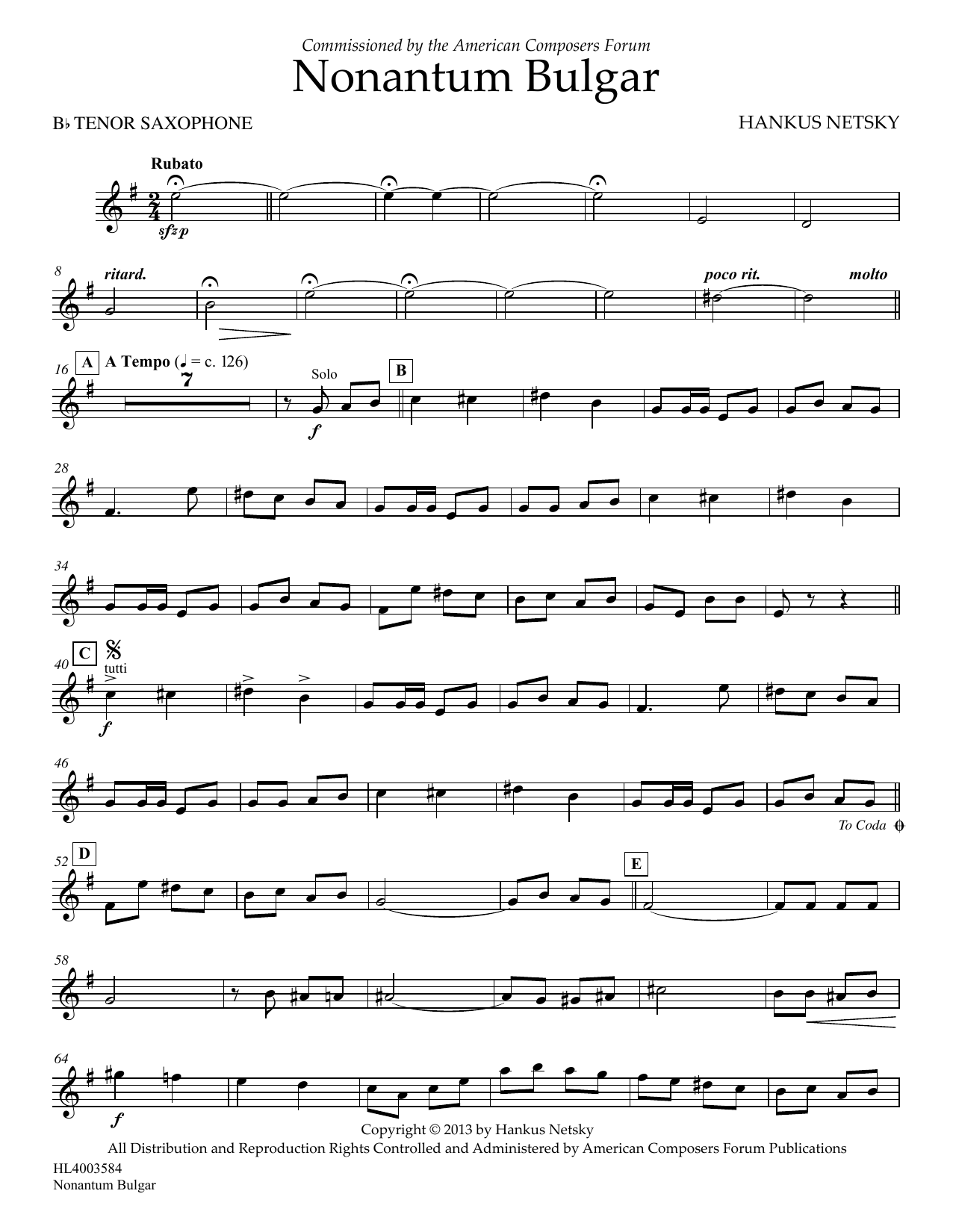 Download or print Hankus Netsky Nonantum Bulgar - Bb Tenor Saxophone sheet music, chords and digital score arranged for Concert Band. This Concert score includes 2 page(s).