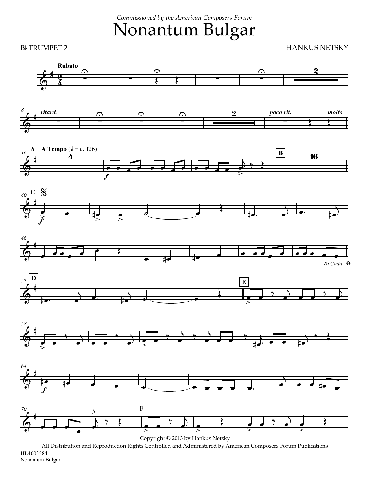 Download or print Hankus Netsky Nonantum Bulgar - Bb Trumpet 2 sheet music, chords and digital score arranged for Concert Band. This Concert score includes 2 page(s).