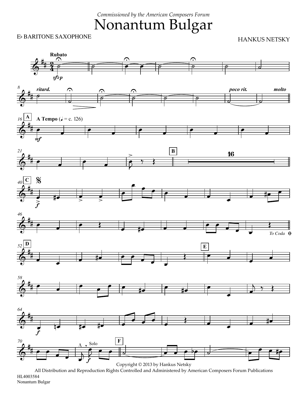 Download or print Hankus Netsky Nonantum Bulgar - Eb Baritone Saxophone sheet music, chords and digital score arranged for Concert Band. This Concert score includes 2 page(s).