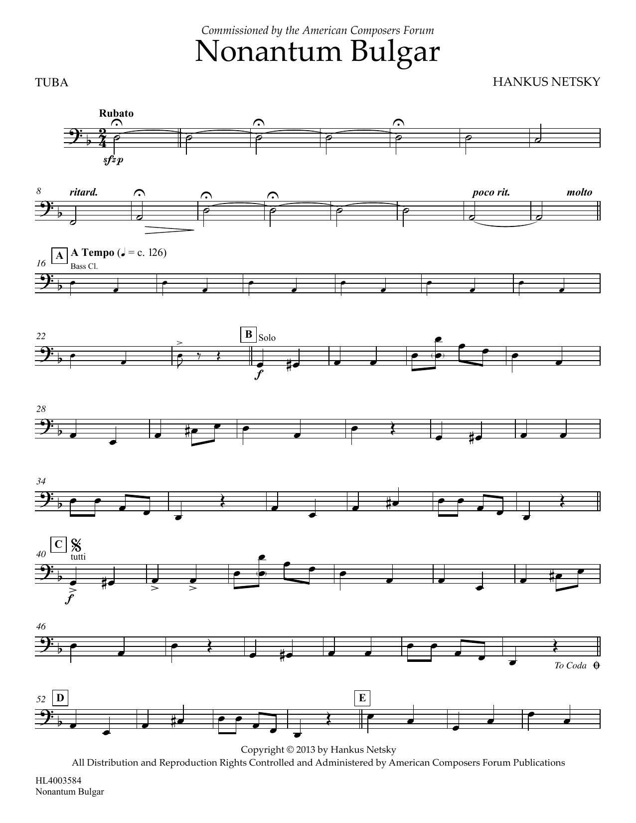 Download or print Hankus Netsky Nonantum Bulgar - Tuba sheet music, chords and digital score arranged for Concert Band. This Concert score includes 2 page(s).