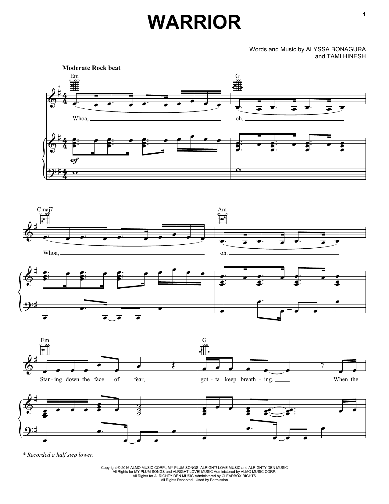 Download or print Hannah Kerr Warrior sheet music, chords and digital score arranged for Piano, Vocal & Guitar Chords (Right-Hand Melody). This Pop score includes 7 page(s).
