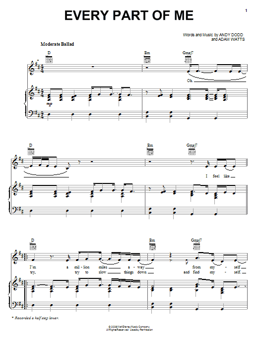 Download or print Hannah Montana Every Part Of Me sheet music, chords and digital score arranged for Piano, Vocal & Guitar Chords (Right-Hand Melody). This Disney score includes 5 page(s).