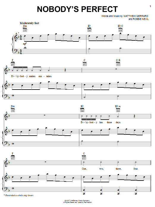 Download or print Hannah Montana Nobody's Perfect sheet music, chords and digital score arranged for Piano, Vocal & Guitar Chords (Right-Hand Melody). This Disney score includes 8 page(s).