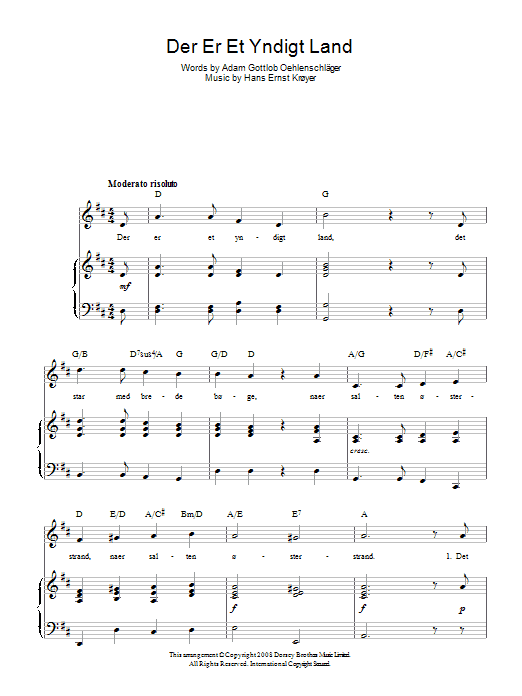 Download or print Hans Ernst Kroyer Der Er Et Yndigt Land (Danish National Anthem) sheet music, chords and digital score arranged for Piano, Vocal & Guitar Chords. This Inspirational score includes 2 page(s).