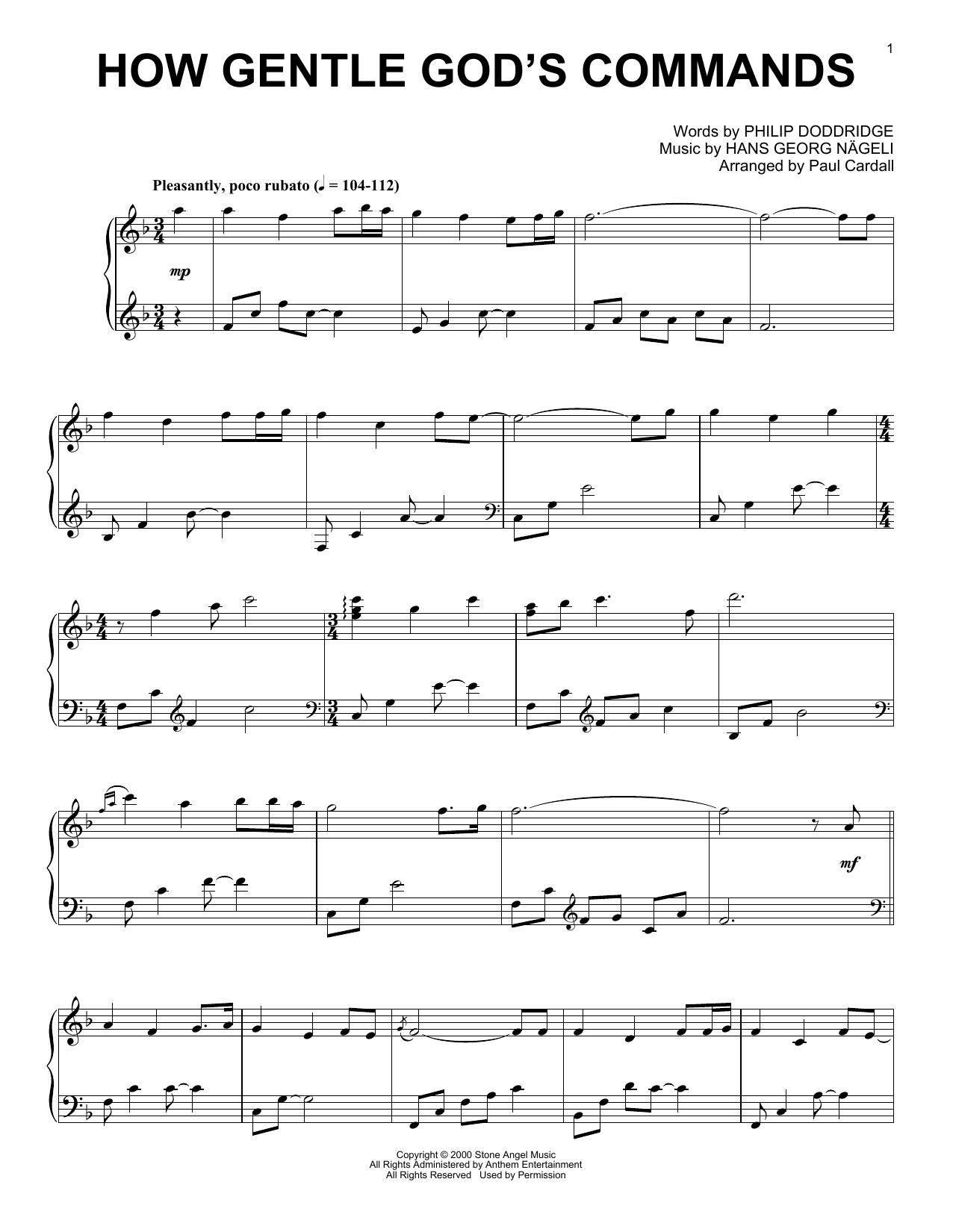 Download or print Hans Georg Nageli How Gentle God's Commands (arr. Paul Cardall) sheet music, chords and digital score arranged for Piano Solo. This Gospel score includes 3 page(s).