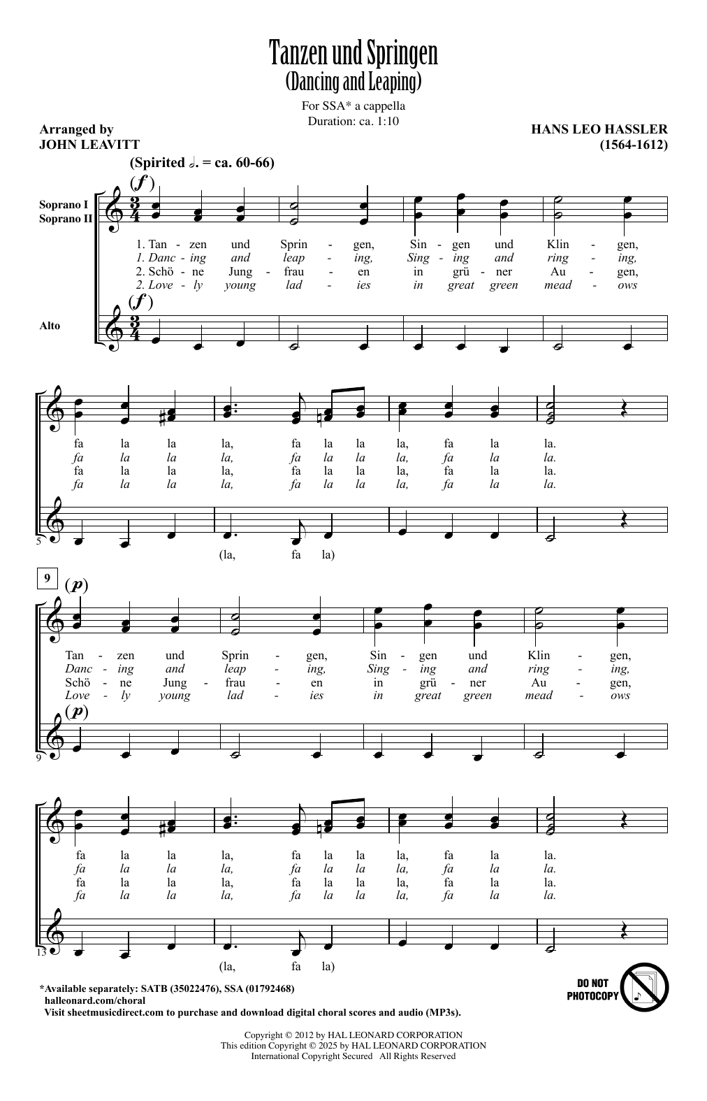 Download or print Hans Leo Hassler Tanzen Und Springen (Dancing And Leaping) (arr. John Leavitt) sheet music, chords and digital score arranged for SSA Choir. This Concert score includes 3 page(s).