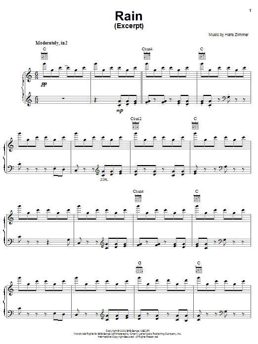 Download or print Hans Zimmer Rain sheet music, chords and digital score arranged for Piano, Vocal & Guitar Chords (Right-Hand Melody). This Children score includes 2 page(s).