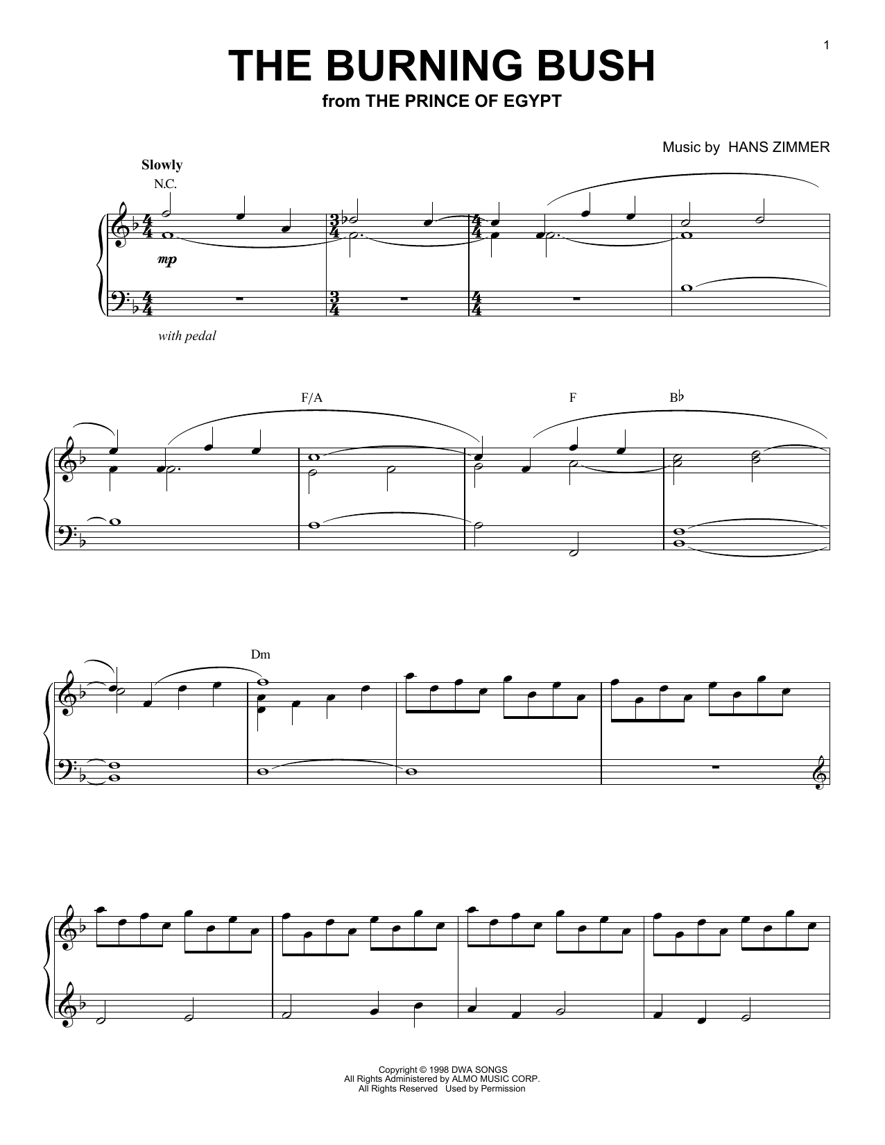 Download or print Hans Zimmer The Burning Bush (from The Prince of Egypt) sheet music, chords and digital score arranged for Piano Solo. This Children score includes 2 page(s).