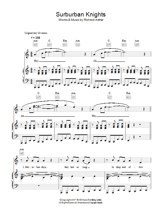 Download or print Hard-Fi Suburban Knights sheet music, chords and digital score arranged for Guitar Chords/Lyrics. This Rock score includes 3 page(s).