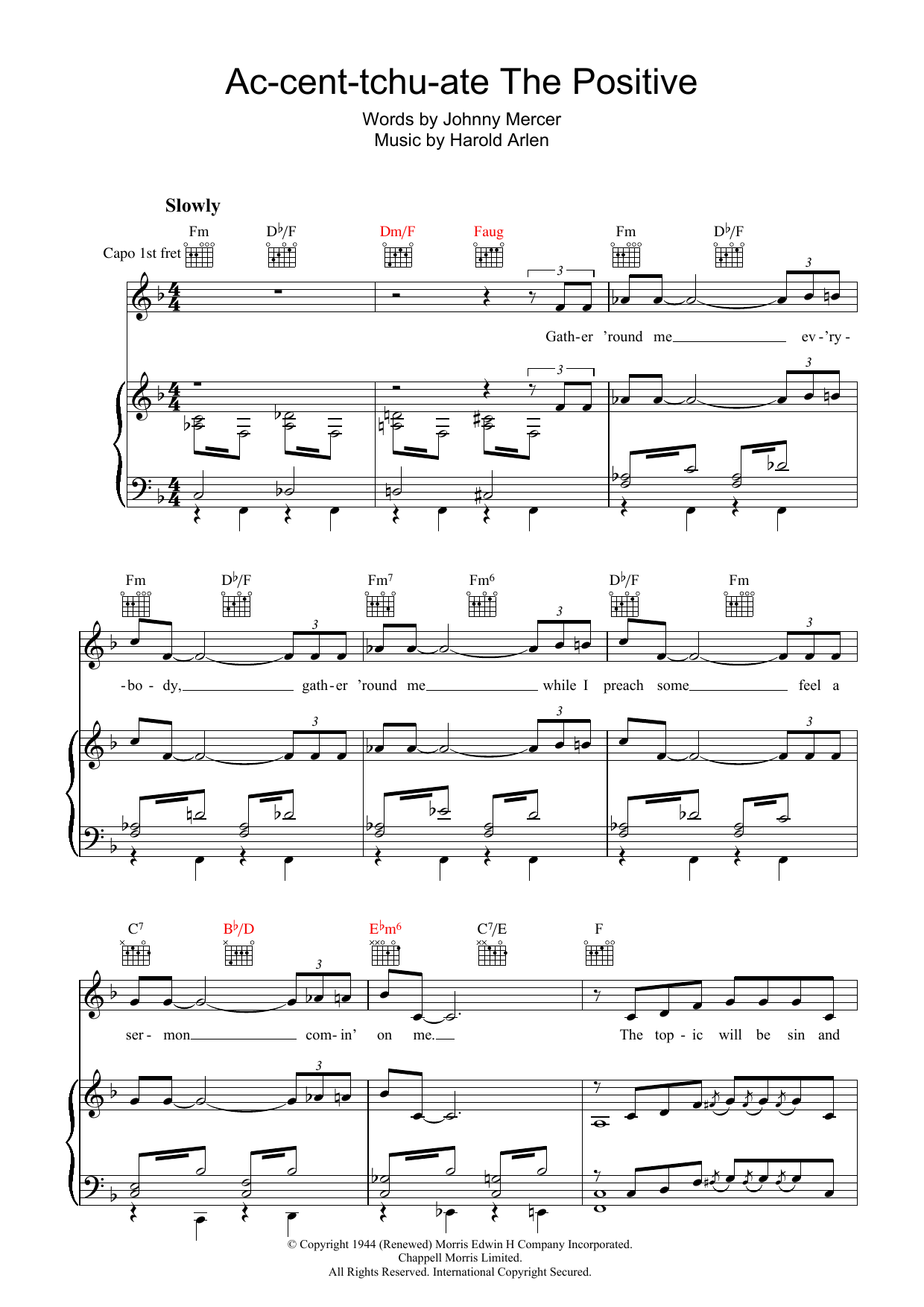 Download or print Harold Arlen Ac-cent-tchu-ate The Positive sheet music, chords and digital score arranged for Piano, Vocal & Guitar Chords. This Jazz score includes 4 page(s).
