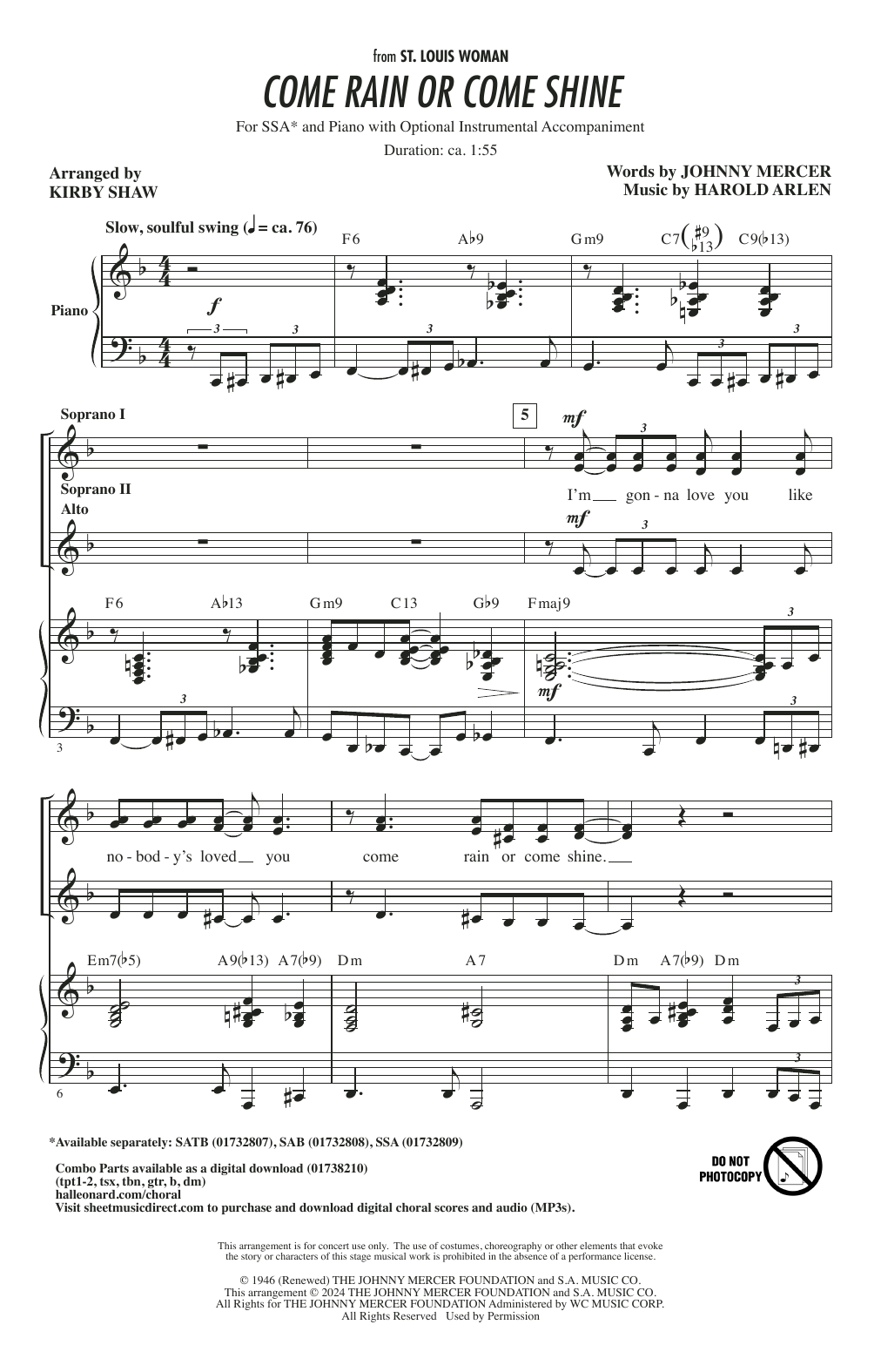 Download or print Harold Arlen Come Rain Or Come Shine (arr. Kirby Shaw) sheet music, chords and digital score arranged for SSA Choir. This Jazz score includes 7 page(s).