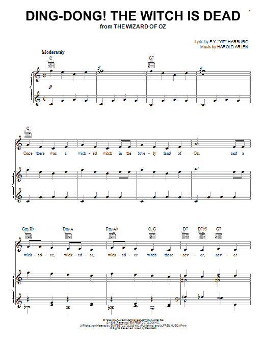 Download or print Harold Arlen Ding-Dong! The Witch Is Dead sheet music, chords and digital score arranged for Very Easy Piano. This Film/TV score includes 4 page(s).
