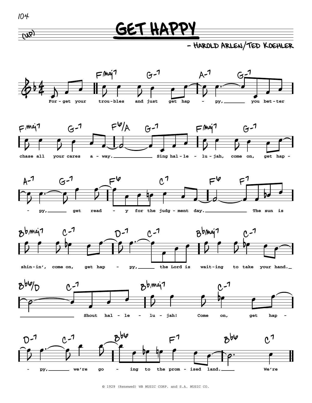 Download or print Harold Arlen Get Happy (High Voice) sheet music, chords and digital score arranged for Real Book – Melody, Lyrics & Chords. This Jazz score includes 2 page(s).