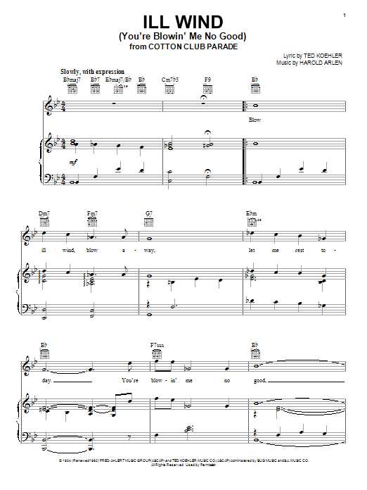 Download or print Harold Arlen Ill Wind (You're Blowin' Me No Good) sheet music, chords and digital score arranged for Piano, Vocal & Guitar Chords (Right-Hand Melody). This Jazz score includes 4 page(s).