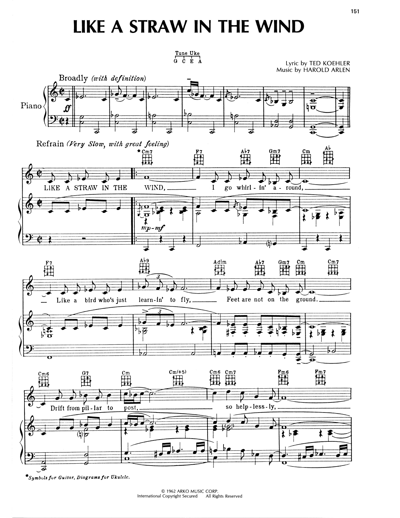 Download or print Harold Arlen Like A Straw In The Wind sheet music, chords and digital score arranged for Piano, Vocal & Guitar Chords (Right-Hand Melody). This Jazz score includes 3 page(s).