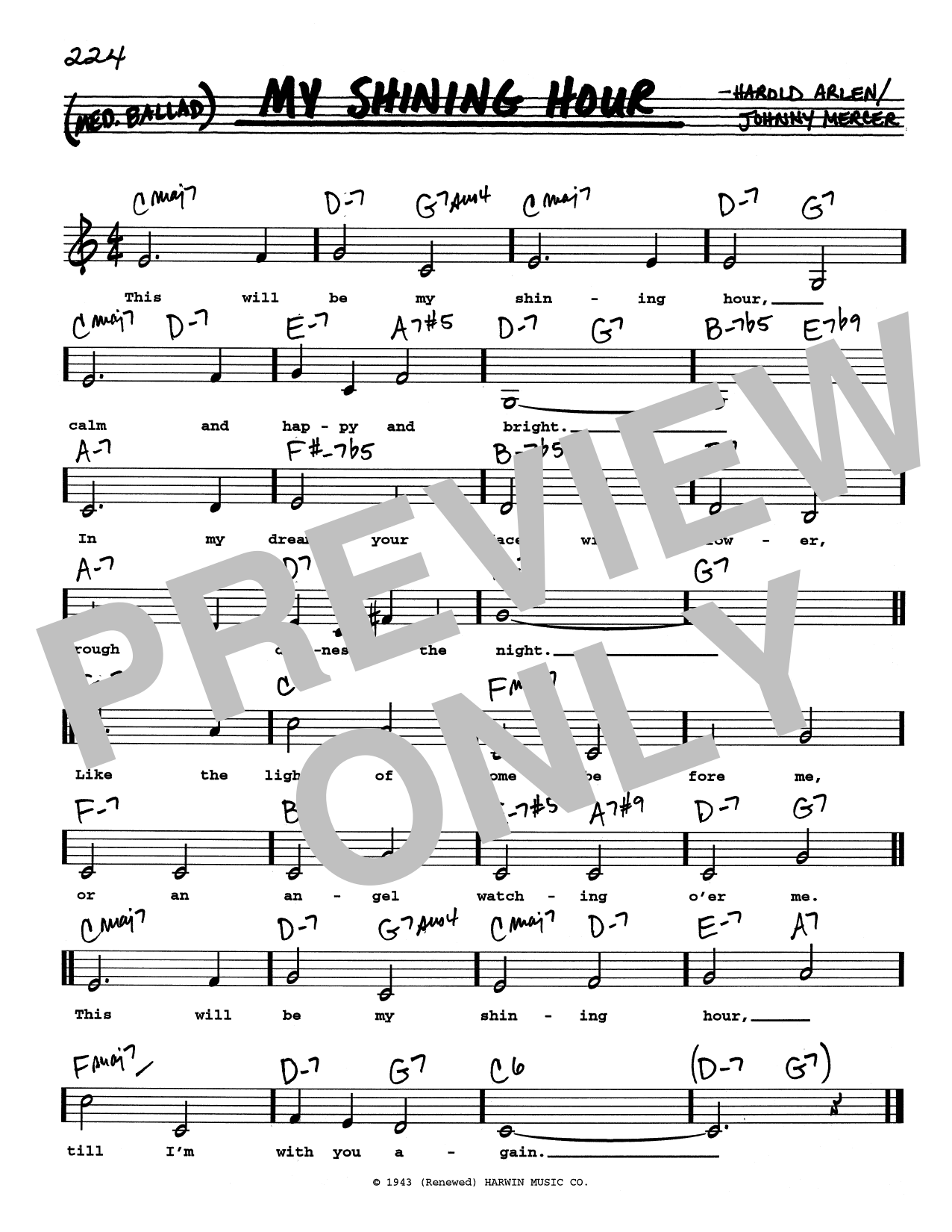 Download or print Harold Arlen My Shining Hour (Low Voice) sheet music, chords and digital score arranged for Real Book – Melody, Lyrics & Chords. This Jazz score includes 1 page(s).
