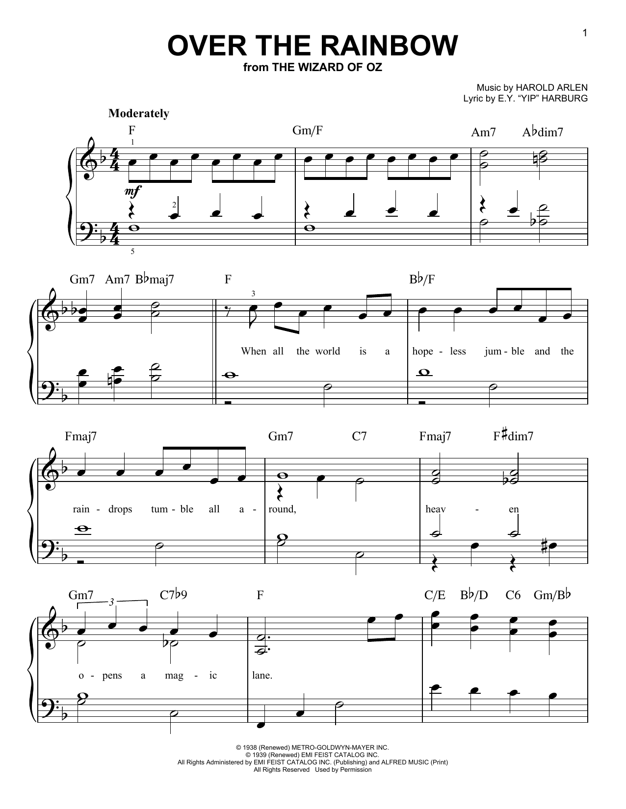 Download or print Harold Arlen Over The Rainbow sheet music, chords and digital score arranged for Easy Piano. This Film/TV score includes 5 page(s).