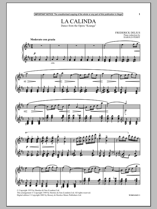Download or print Harold Perry La Calinda (Dance from The Opera Koanga) sheet music, chords and digital score arranged for Piano Solo. This Classical score includes 6 page(s).