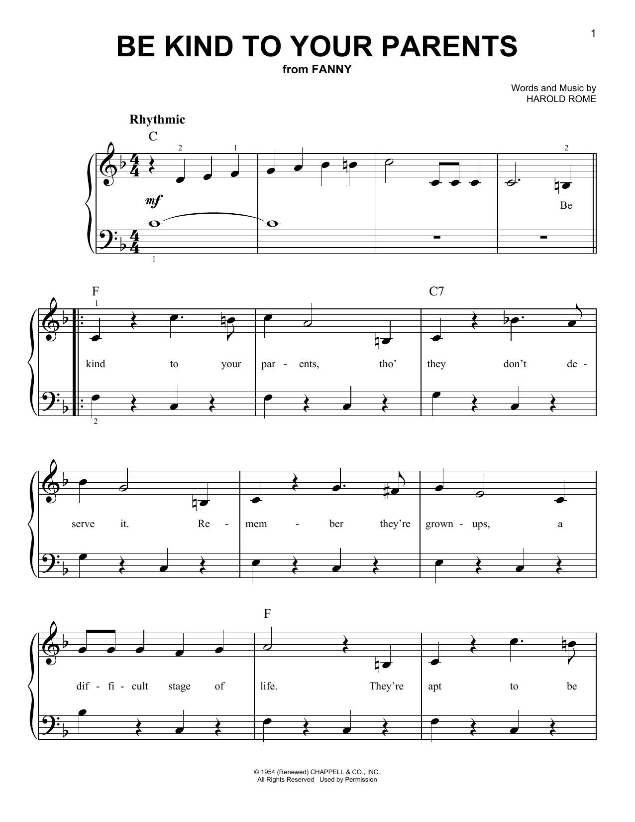 Download or print Harold Rome Be Kind To Your Parents sheet music, chords and digital score arranged for Lead Sheet / Fake Book. This Children score includes 1 page(s).