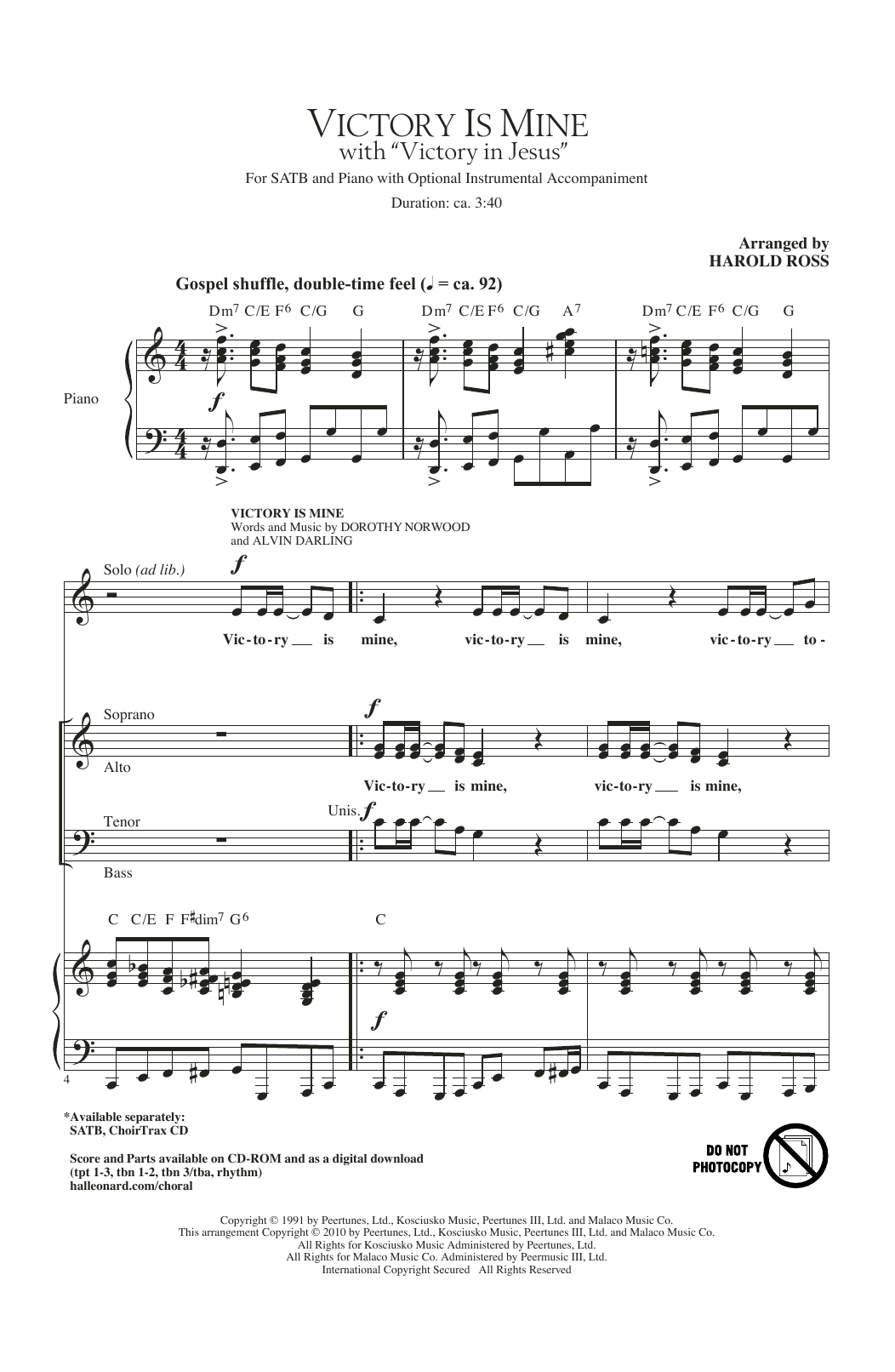Download or print Harold Ross Victory Is Mine (with "Victory In Jesus") sheet music, chords and digital score arranged for SATB Choir. This Hymn score includes 14 page(s).