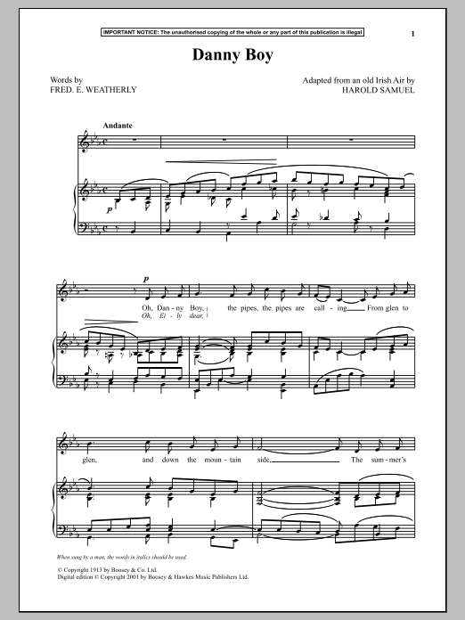 Download or print Harold Samuel Danny Boy sheet music, chords and digital score arranged for Piano & Vocal. This Traditional score includes 4 page(s).