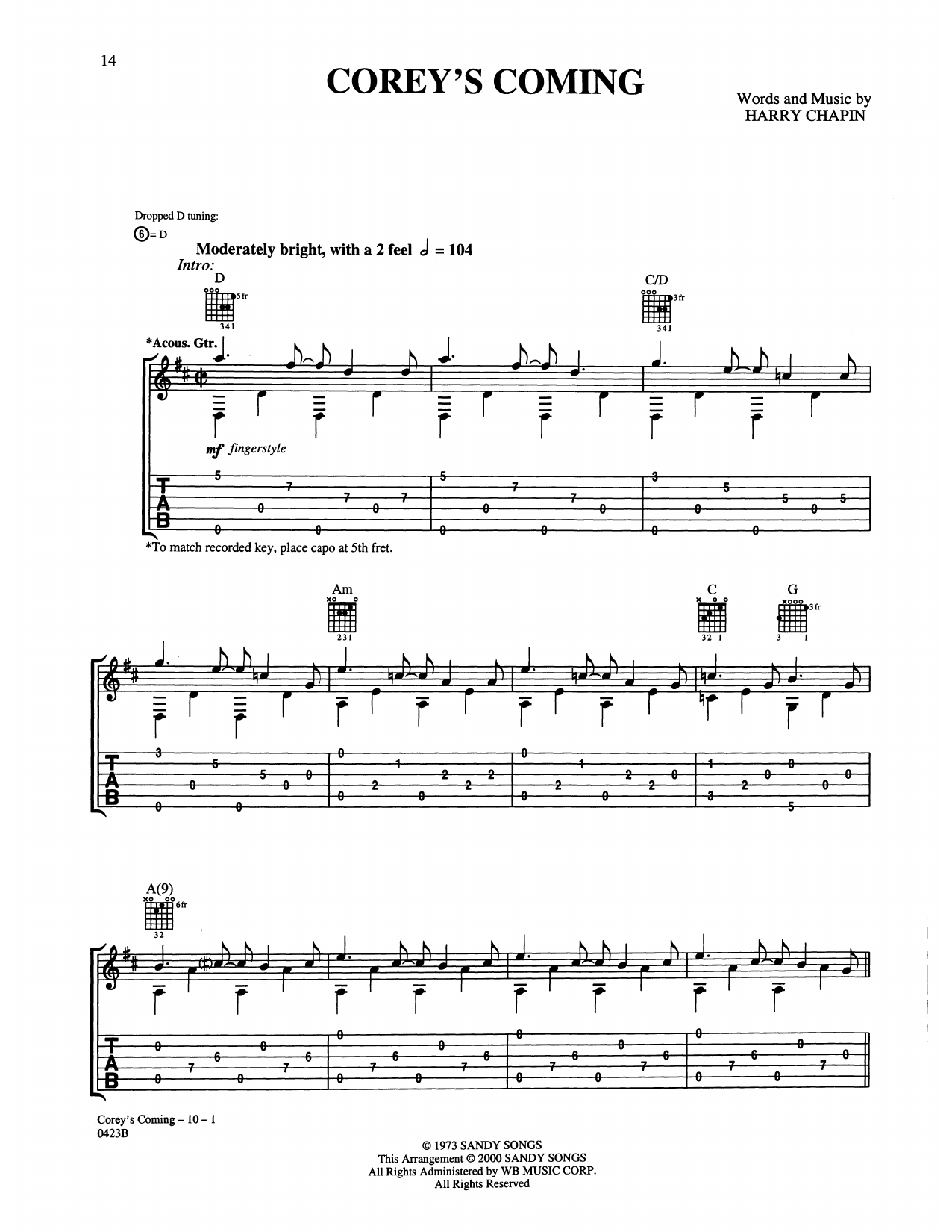 Download or print Harry Chapin Corey's Coming sheet music, chords and digital score arranged for Guitar Tab. This Pop score includes 10 page(s).