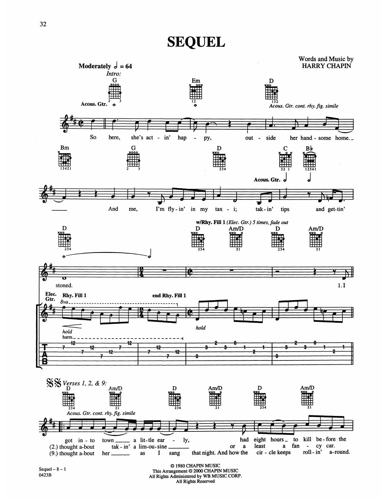 Download or print Harry Chapin Sequel sheet music, chords and digital score arranged for Guitar Tab. This Pop score includes 8 page(s).