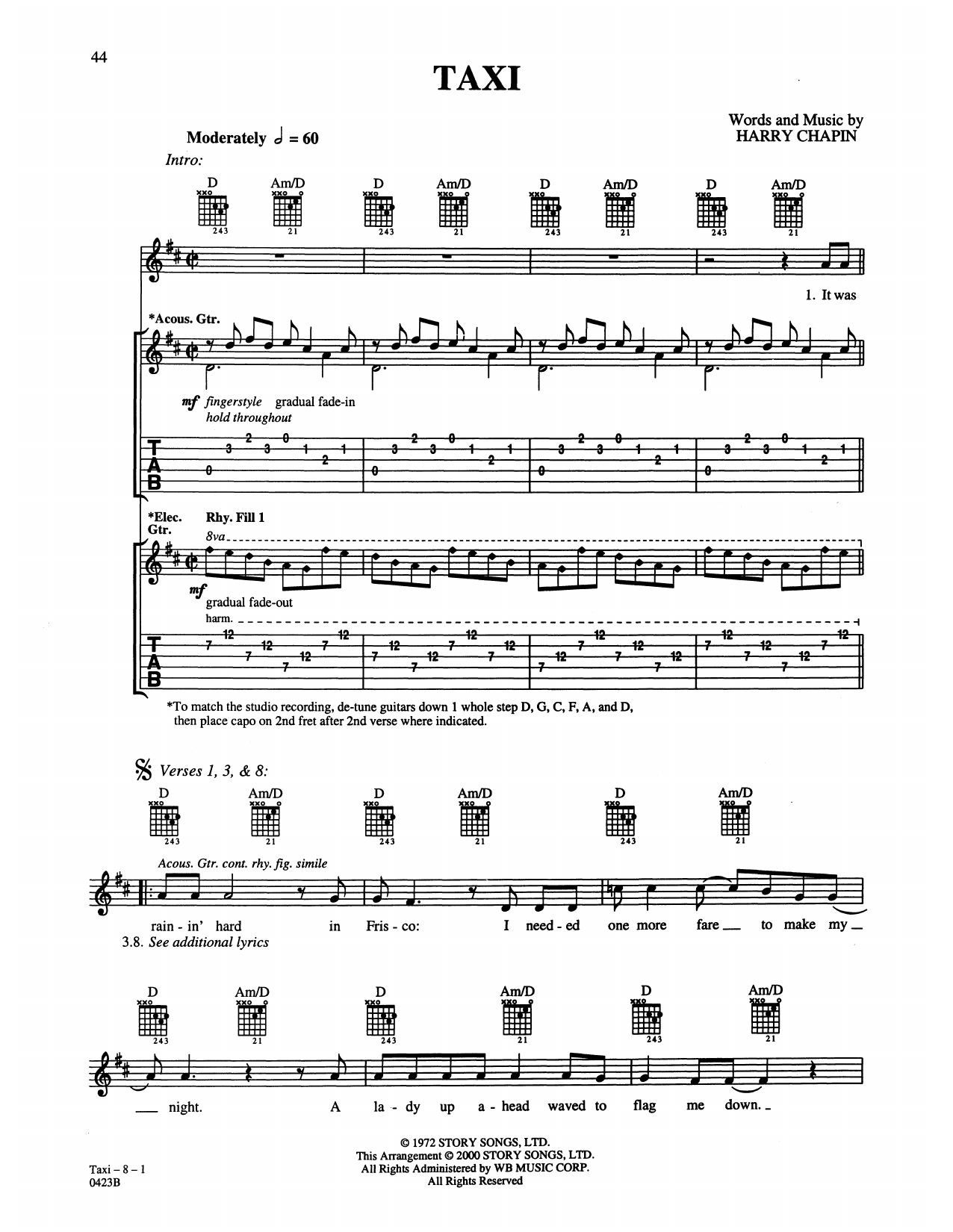Download or print Harry Chapin Taxi sheet music, chords and digital score arranged for Easy Piano. This Pop score includes 14 page(s).