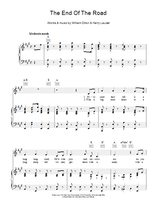 Download or print Harry Lauder The End Of The Road sheet music, chords and digital score arranged for Piano, Vocal & Guitar Chords. This Pop score includes 4 page(s).