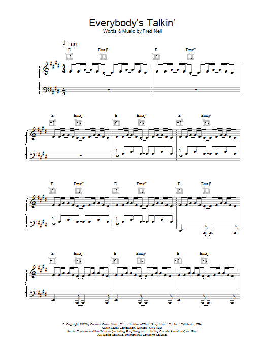 Download or print Harry Nilsson Everybody's Talkin' sheet music, chords and digital score arranged for Piano, Vocal & Guitar Chords (Right-Hand Melody). This Pop score includes 4 page(s).