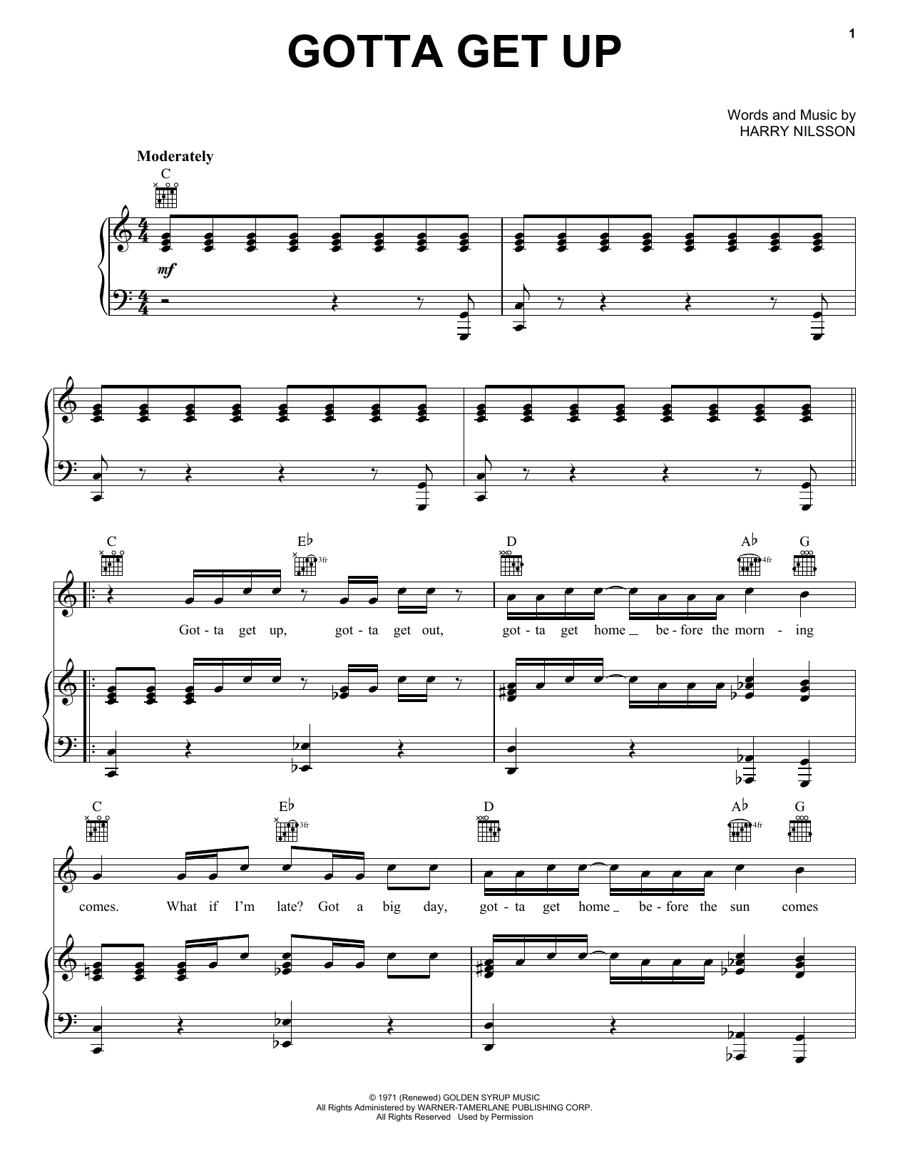 Download or print Harry Nilsson Gotta Get Up sheet music, chords and digital score arranged for Piano, Vocal & Guitar Chords (Right-Hand Melody). This Pop score includes 4 page(s).