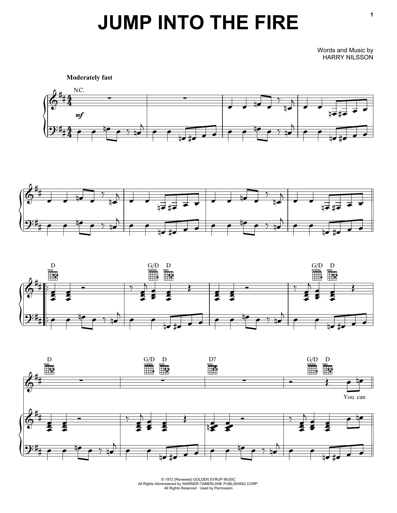 Download or print Harry Nilsson Jump Into The Fire sheet music, chords and digital score arranged for Piano, Vocal & Guitar Chords (Right-Hand Melody). This Pop score includes 3 page(s).