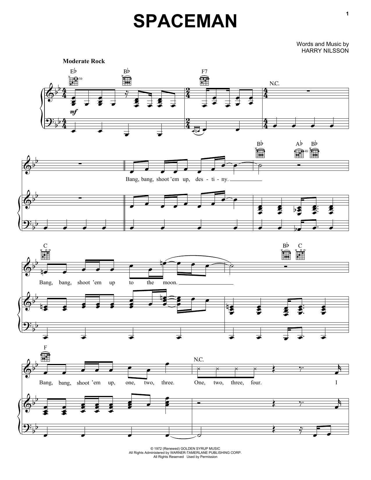 Download or print Harry Nilsson Spaceman sheet music, chords and digital score arranged for Piano, Vocal & Guitar Chords (Right-Hand Melody). This Pop score includes 7 page(s).