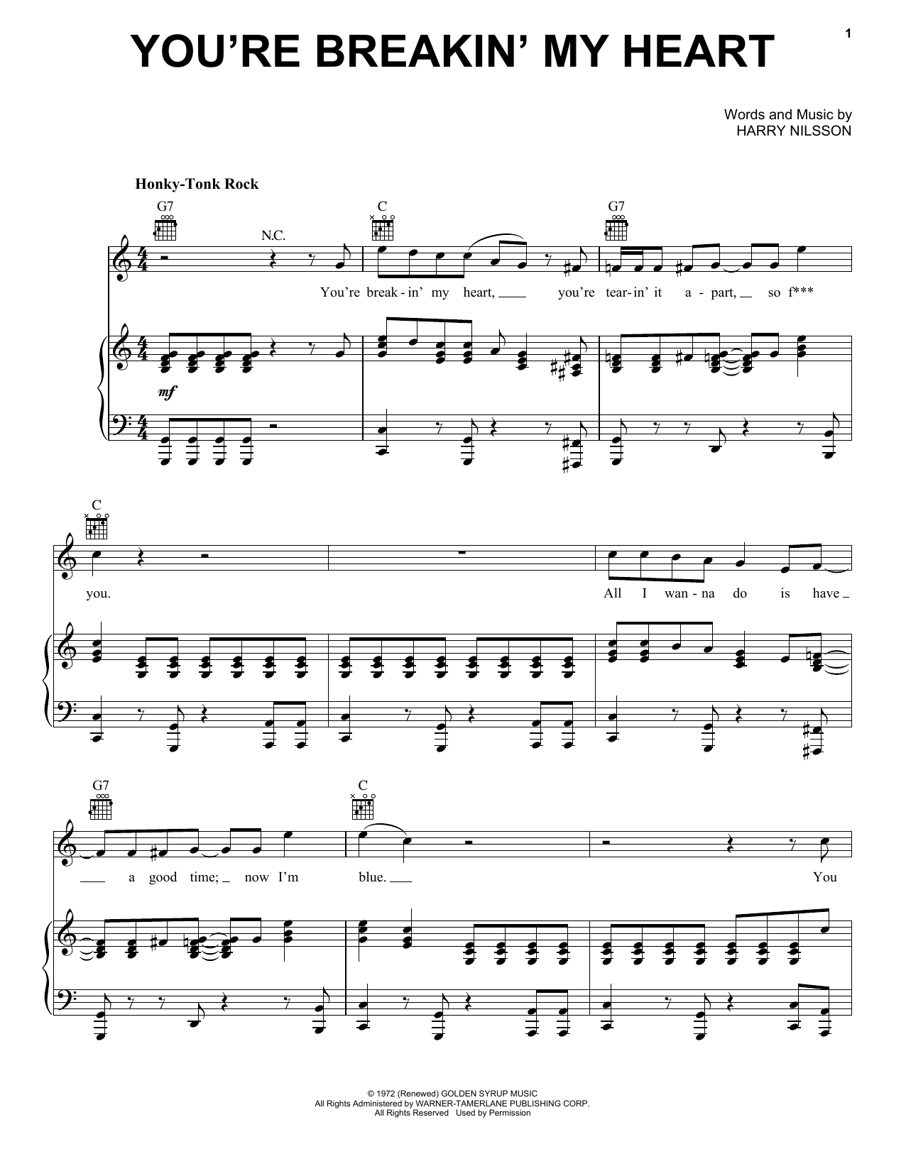 Download or print Harry Nilsson You're Breakin' My Heart sheet music, chords and digital score arranged for Piano, Vocal & Guitar Chords (Right-Hand Melody). This Pop score includes 6 page(s).