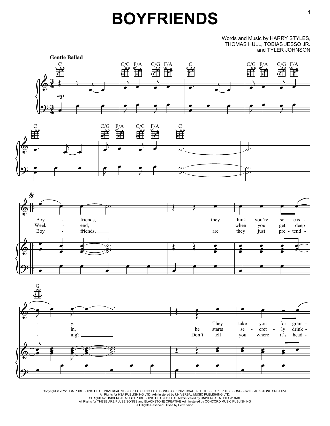 Download or print Harry Styles Boyfriends sheet music, chords and digital score arranged for Piano, Vocal & Guitar Chords (Right-Hand Melody). This Pop score includes 6 page(s).