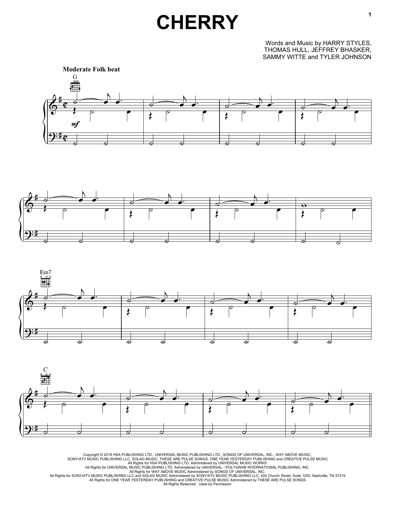Download or print Harry Styles Cherry sheet music, chords and digital score arranged for Piano, Vocal & Guitar Chords (Right-Hand Melody). This Pop score includes 8 page(s).