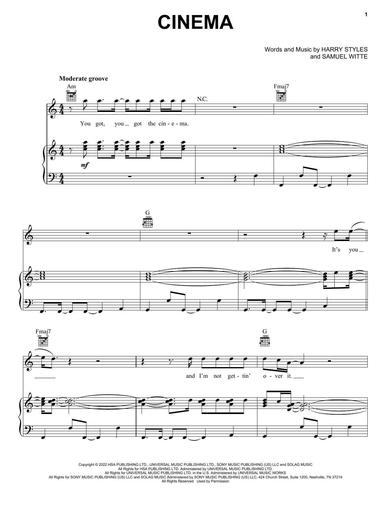 Download or print Harry Styles Cinema sheet music, chords and digital score arranged for Piano, Vocal & Guitar Chords (Right-Hand Melody). This Pop score includes 8 page(s).