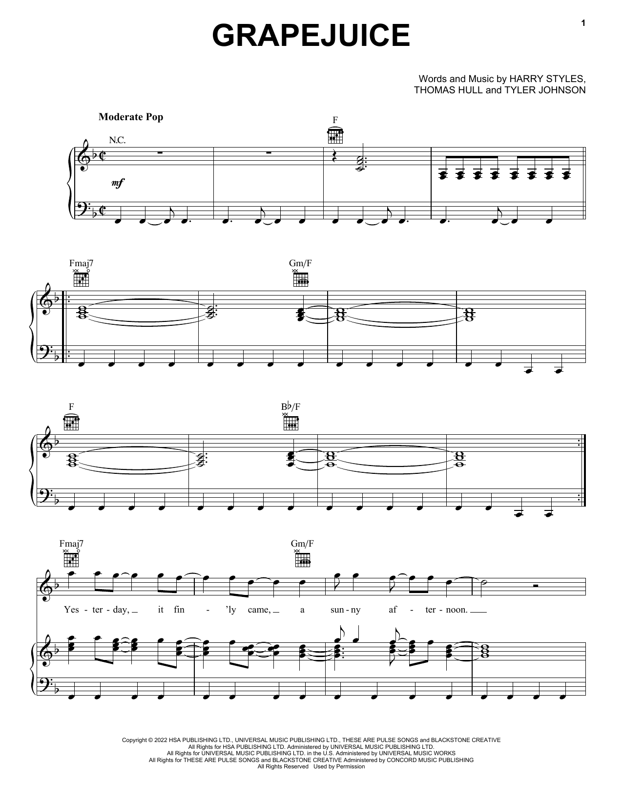 Download or print Harry Styles Grapejuice sheet music, chords and digital score arranged for Piano, Vocal & Guitar Chords (Right-Hand Melody). This Pop score includes 6 page(s).