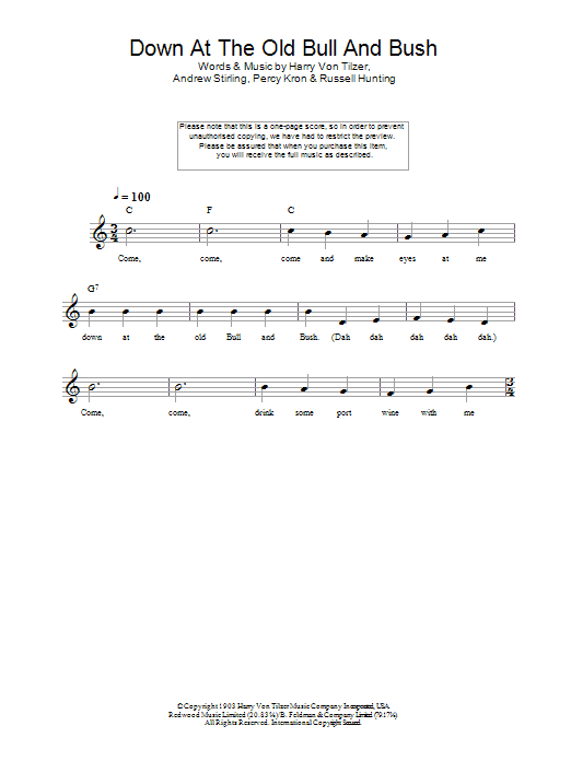 Download or print Harry Von Tilzer Down At The Old Bull And Bush sheet music, chords and digital score arranged for Lead Sheet / Fake Book. This Standards score includes 2 page(s).