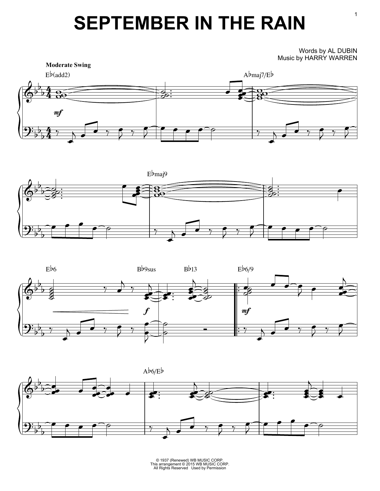 Download or print Harry Warren & Al Dubin September In The Rain [Jazz version] (arr. Brent Edstrom) sheet music, chords and digital score arranged for Piano Solo. This Jazz score includes 5 page(s).
