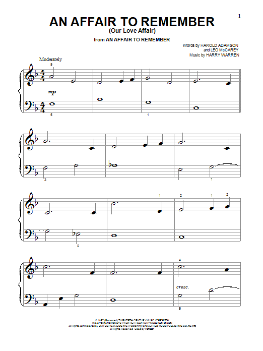 Download or print Harry Warren An Affair To Remember (Our Love Affair) sheet music, chords and digital score arranged for Beginning Piano Solo. This Jazz score includes 3 page(s).
