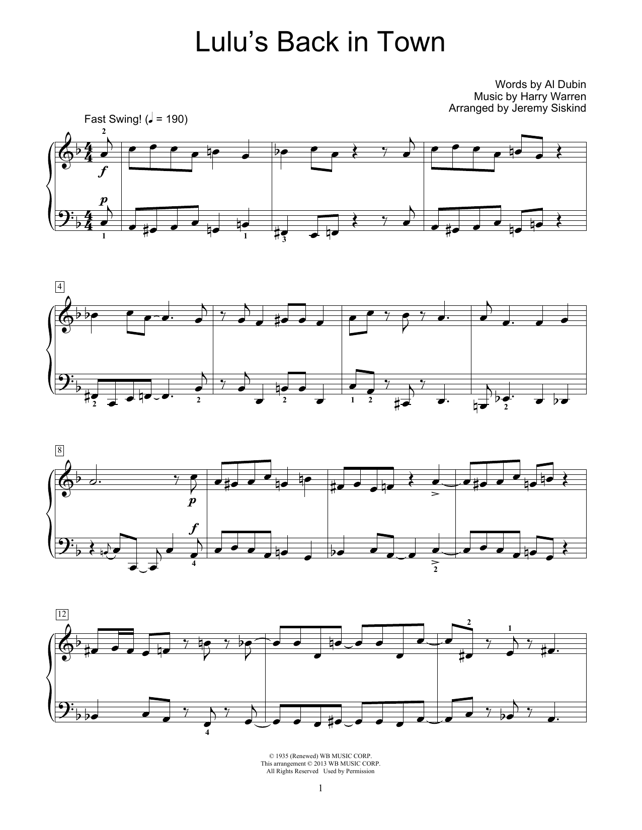 Download or print Al Dubin Lulu's Back In Town sheet music, chords and digital score arranged for Piano, Vocal & Guitar Chords. This Pop score includes 5 page(s).