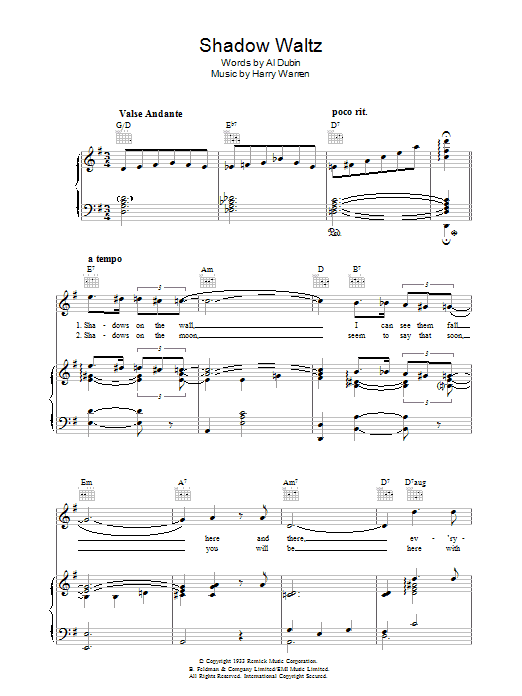 Download or print Harry Warren Shadow Waltz sheet music, chords and digital score arranged for Piano, Vocal & Guitar Chords. This Pop score includes 6 page(s).