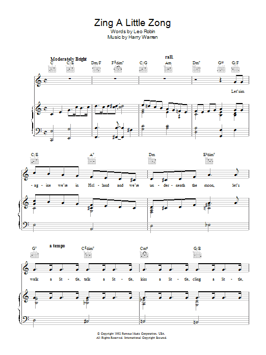 Download or print Harry Warren Zing A Little Zong sheet music, chords and digital score arranged for Piano, Vocal & Guitar Chords. This Standards score includes 5 page(s).