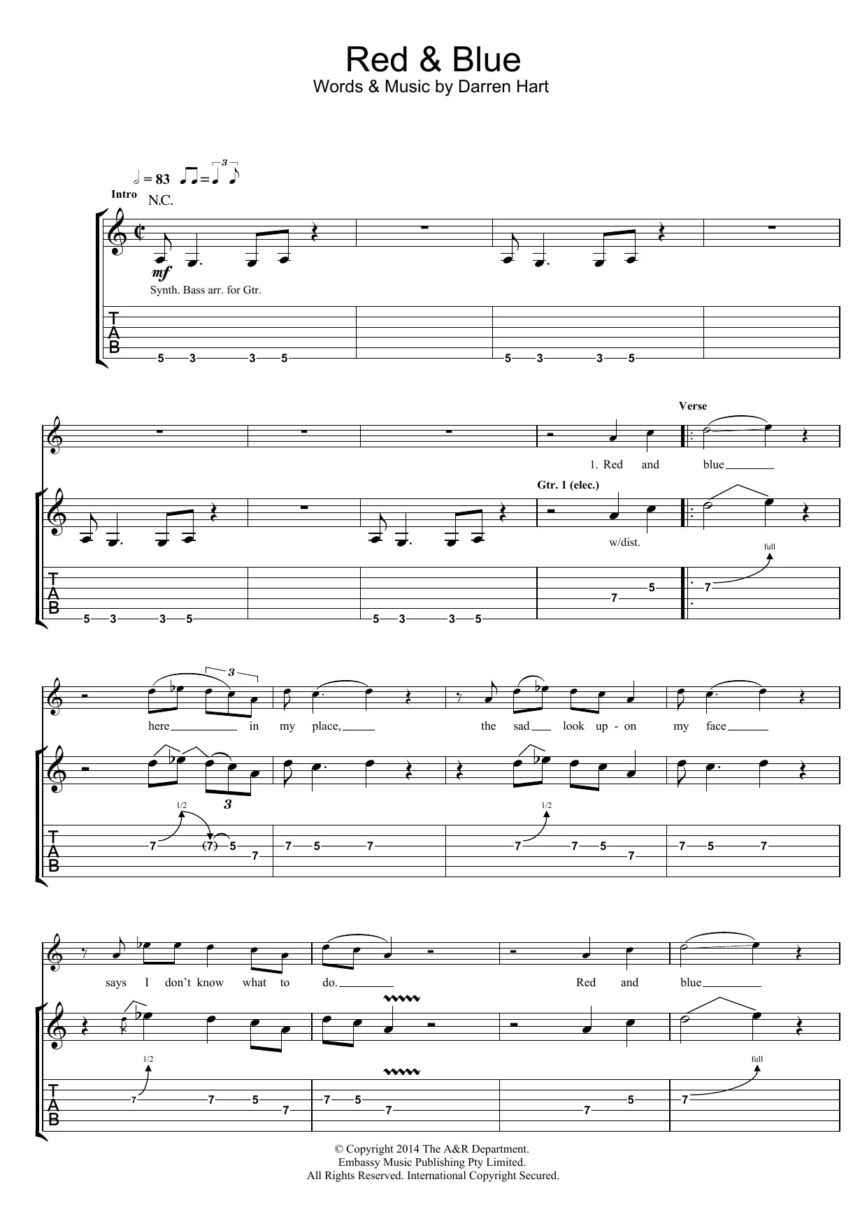 Download or print Harts Red And Blue sheet music, chords and digital score arranged for Guitar Tab. This Rock score includes 7 page(s).
