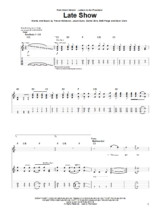 Download or print Hawk Nelson Late Show sheet music, chords and digital score arranged for Guitar Tab. This Christian score includes 5 page(s).